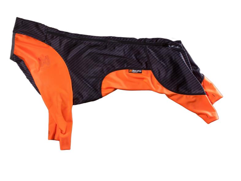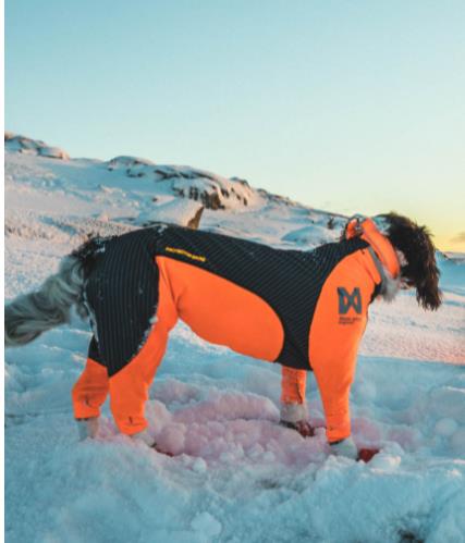 Protector Snow fra Non-Stop er en heldress for hunder (female/tispe) i aktivetet, ideelt til bruk i fjellet. Den er laget i et tynt og elastisk materiale som beskytter mot snø, is, kulde og vind. Dressen er formsydd og skal sitte tett, mens det elastiske materialet sørger for at hunden har god bevegelsesfrihet. Den orange fargen og refleks gjør at dekkenet er godt synlig. Den kommer i to varianter, tispe og hannhund.