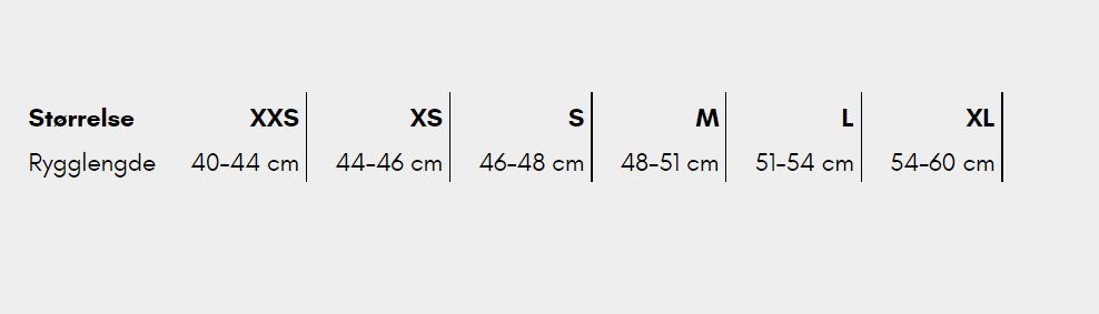Rygglengde female/tispe: 42cm (XXS), 44cm (XS), 46cm (S), 48cm (M), 50cm (L)